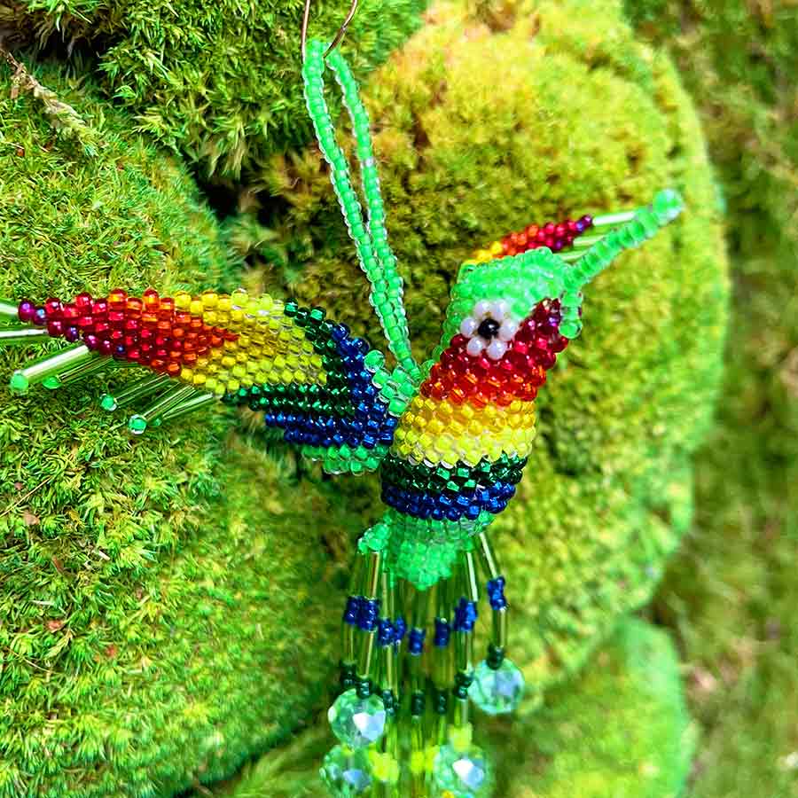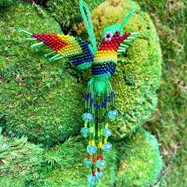 Kolibřík má korálkové poutko pro pověšení, a tak může sloužit jako klíčenka nebo pro dekoraci oken.. Věříme, že vás napadne spoustu nápadů kam si tohoto krásného kolibříka pověsit 🙂