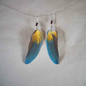 Náušnice z papouščího peří od kmene Shipibo v Peru. Tyto krásné náušnice jsme přivezli z Peru, kde je v amazonském pralese vyrobili domorodé ženy kmene Shipibo. Ženy domorodých kmenů sbírají peříčka od papoušků, které jim přirozeně vypadnou, takže žádný papoušek kvůli těmto náušnicím nebyl ohrožen ani netrpěl.